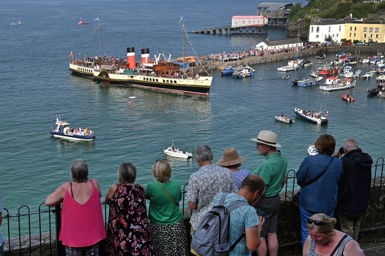 Crowds lined the seafront roads and gardens, and all the paths of Castle Hill, to see the world’s last seagoing paddle steamer on her visit to the picturesque harbour.
